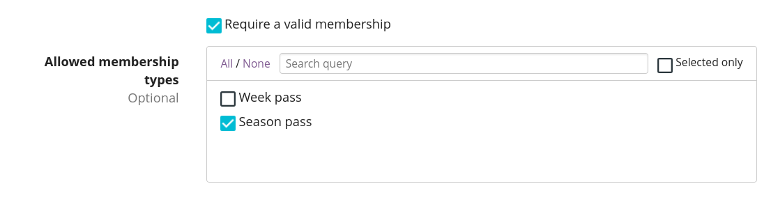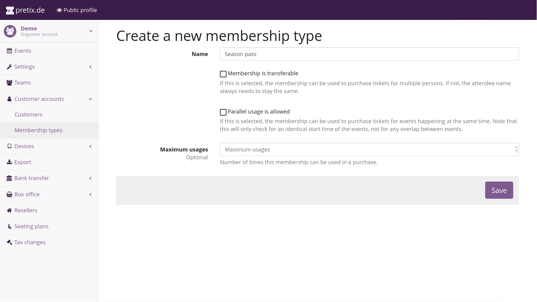 You can name the membership type in a way that clearly explains where it is valid, e.g. “season pass main location” or “season pass all locations”. There are a few details you can configure on this page, such as whether the season pass can be used by multiple different persons, or if the season pass can be used for multiple tickets for the same time slot. You can also define a maximum number of usages, which is useful if you e.g. use this feature to add a “ticket of ten”.